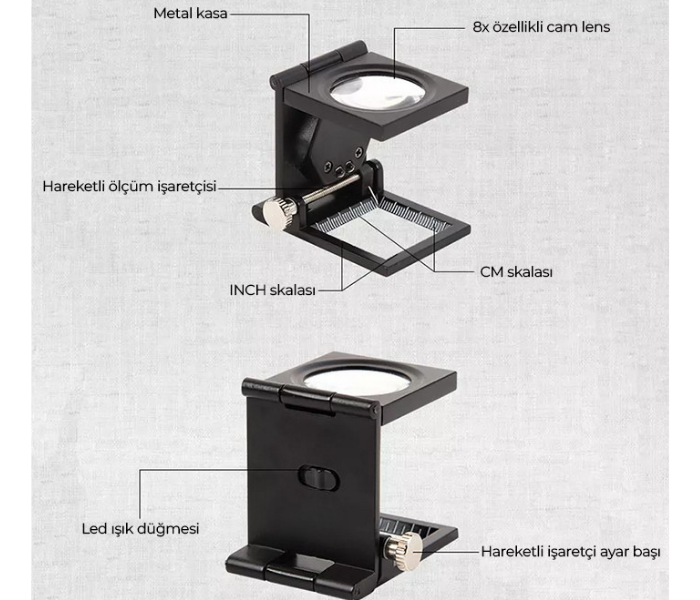 Büyütecin ölçüm skalası üzerinden hem santimetre (cm) hem de inç biriminde ölçüm yapılabilmektedir.