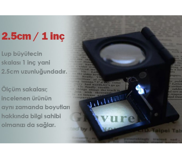 - Lup büyütecin skalası 1 inç yani 2.5cm uzunluğundadır. İncelenen ürünün aynı zamanda boyutları hakkında bilgi sahibi olmanızı da sağlar.