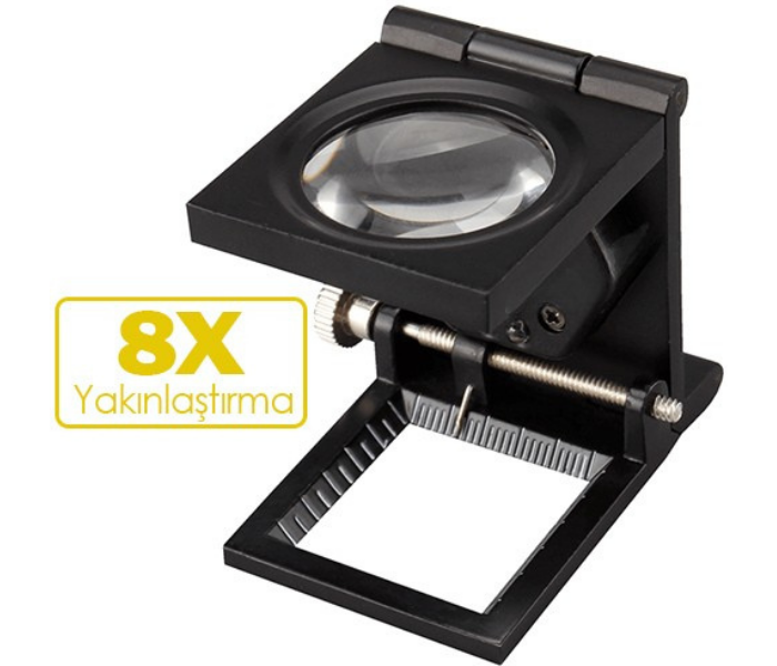 9005A mini metal büyüteç; ofis, üretim, eğitim vb. alanlarda kullanabileceğiniz, dış yapısı metal ve katlanabilir olan, 8X yakınlaştırmaya sahip, skalalı büyüteç modelidir.
