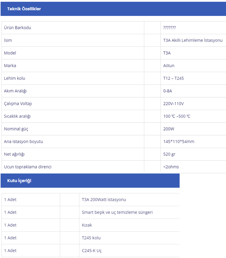 AiXun T3A, dünyanın ilk 200w tam akıllı lehimleme istasyonudur. T12/T245 iki tutamaçla uyumludur ve çeşitli sahnelere uygulanabilir. Akıllı sıcaklık kontrol sistemi ile, sıcaklık doğruluğu sapması %1’den az olacak şekilde 3 saniye içinde hızlı bir şekilde 380°C’ye kadar ısıtabilir. Üst düzey elektronik ürünlerin mobil bakımı ve hassas kaynağı için en uygunudur. 2,4 inç LCD dijital renkli ekran, size daha iyi bir görsel zevk sağlar ve bu da çalışma verimini artırmanıza yarar. Akıllı operatör alışkanlık belleği, kaynak istasyonunun ve lehim uçlarının hizmet ömrünün uzatılmasına yardımcı olabilir. Özellikle cep telefonu tamircisi için olmazsa olmaz bir lehimleme istasyonudur.