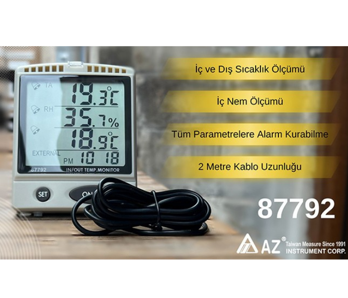 AZ 87792 alarm özellikli ölçüm cihazı; iç mekan sıcaklık ve nem, 2 metre kablosu sayesinde de dış mekan sadece sıcaklık ölçümü yapabilen, geniş dijital göstergeli ölçüm cihazıdır.