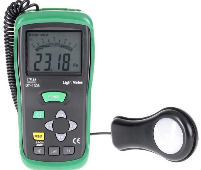 Cem DT-1308 ışık ölçer lüksmetre; LUX ve FC birimleri ile ışık şiddeti ölçümü yapabilen, spiral kablolu sensörü ile hassas bir şekilde ölçüm yapabilmenizi sağlayan bir ölçüm cihazıdır.