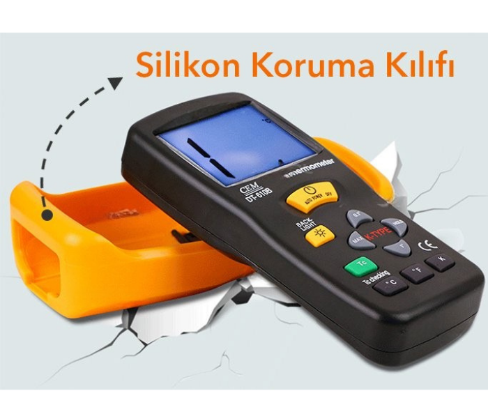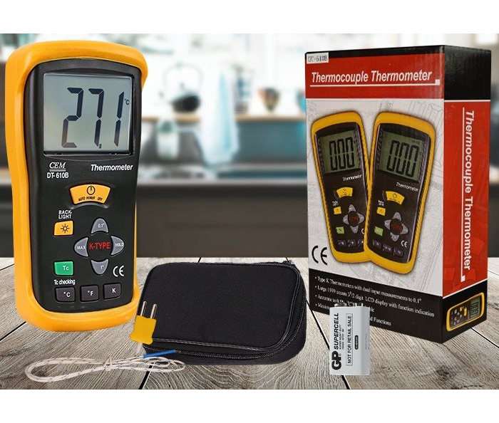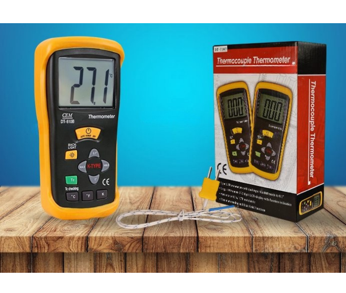 Cem DT-610B tek kanallı K tipi prob okuyucu; k tipi probu sayesinde ortamdaki sıcaklık değeri ölçülebileceği gibi, probun ucunu bir yere değdirerek oranın sıcaklık değeri de ölçülebilmektedir.