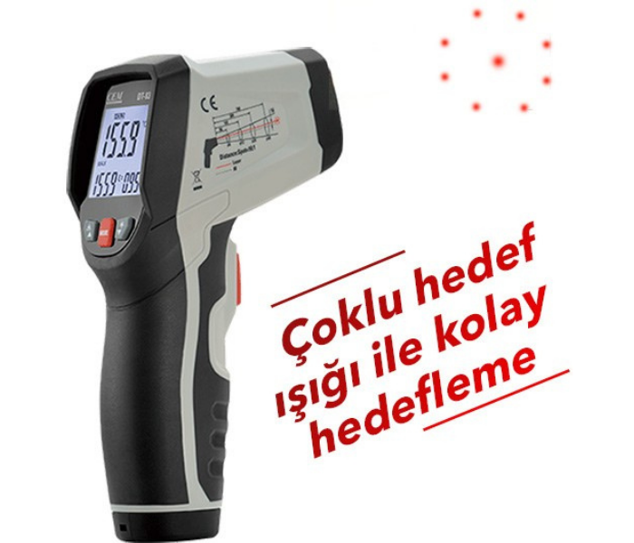 - Lazer termometrenin hedefleme yapan ışığı 8 adet noktadan oluşan dairesel lazer hedeflemeden oluşmaktadır. Dairesel hedefleme nereyi ölçtüğünüzü anlayabilmeniz açısından oldukça yararlı olmaktadır.