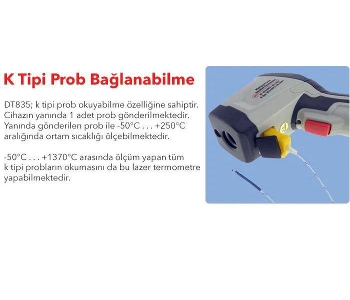 - DT835 lazer termometre k tipi prob okuyabilme özelliğine sahiptir. Yanında kutu içerisinde 1 adet k tipi prob da tarafınıza gönderilmektedir. Cihazın yanında gelen K tipi prob ile -50°C . . . +250°C aralığında ortam sıcaklığı ölçümü yapabilirsiniz.