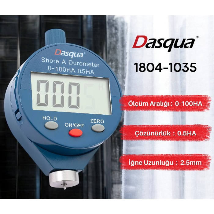 - Dasqua 1804-1035 dijital shore metre cihazı 0 - 100 HA değer arasında; yumuşak kauçuk, silikon, poliüretan ve diğer kauçuk benzeri malzemelerin sertliğini ölçmek için kullanılan bir cihazdır.