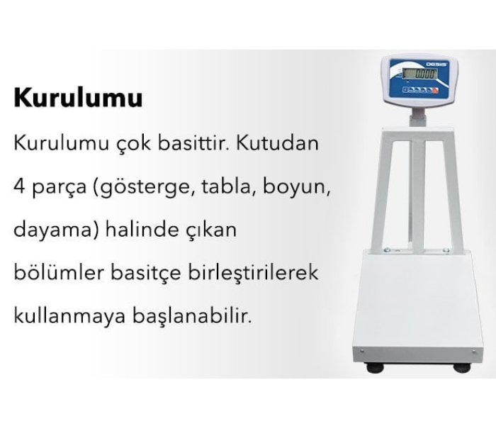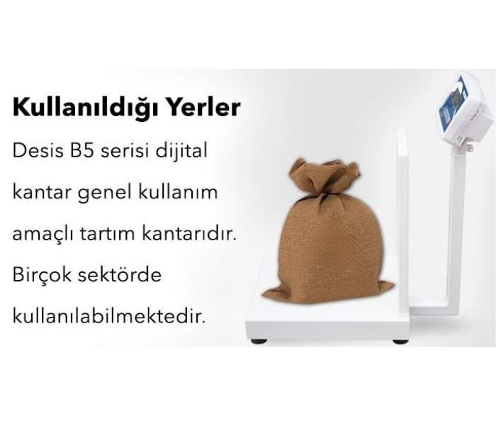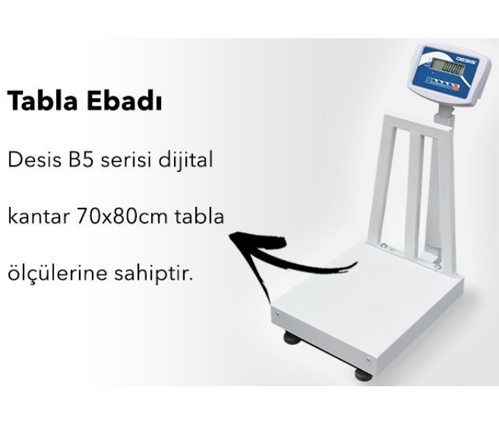 Desis B5 serisi tartım kantarı; 150 kg tartım kapasiteli 50x60 cm tabla ebadına sahip, hızlı tartım yapabilen, genel kullanım amaçlı tartım kantarıdır.