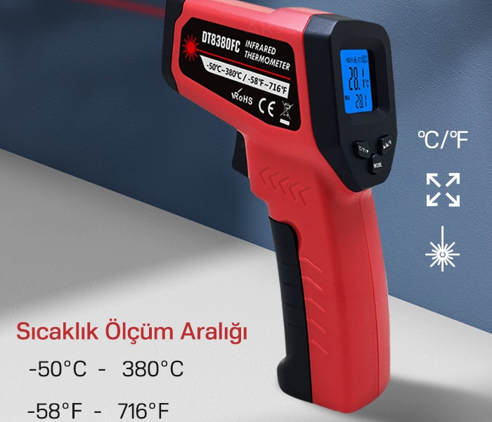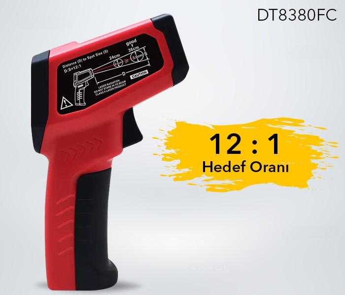 DT8380FC kızılötesi lazerli termometre; ergonomik tasarıma sahip, genel kullanıma hitap eden, -50°C ile +380°C dereceye kadar ölçüm yapabilen tek lazerli sıcaklık ölçüm cihazıdır.