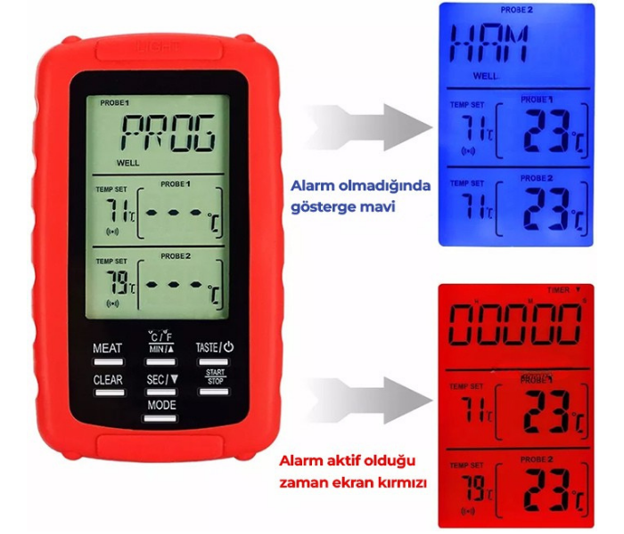 - Pişirilen etin sıcaklığı önceden ayarlanmış sıcaklığa gelince (prob 1 veya 2) alıcı cihaz ekranı kırmızı ışık ile yanacak ve bip sesi duyulacaktır. Ses herhangi bir tuşa basarak kapatılabilir.
