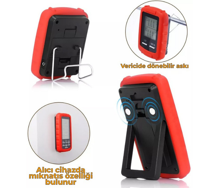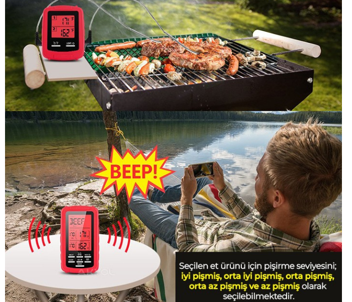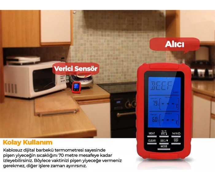 - Bu alarmlı kablosuz dijital barbekü termometresi sayesinde pişen yiyeceğin sıcaklığını 70 metre mesafeye kadar izleyebilirsiniz. Böylece vaktinizi pişen yiyeceğe vermeniz gerekmez, diğer işlere zaman ayırırsınız.