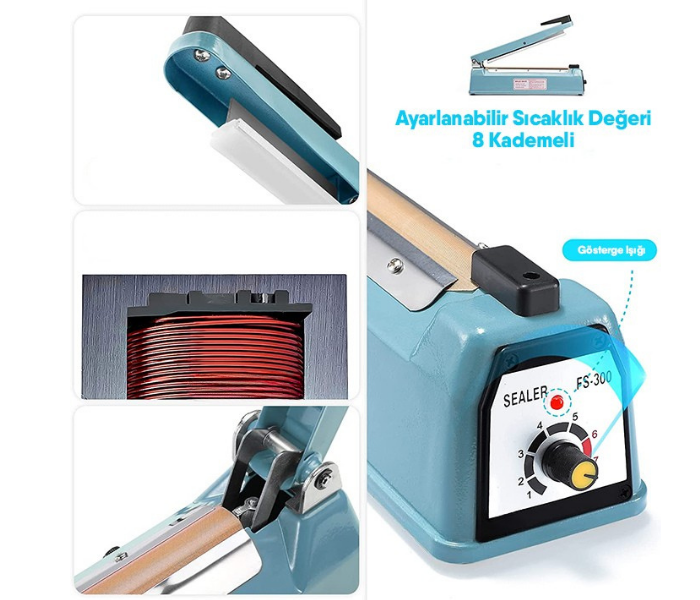- FS 300 poşet ağzı kapatma makinası, 1.5 saniye gibi kısa bir sürede poşetinizin ağzını kapatmanızı sağlamaktadır.