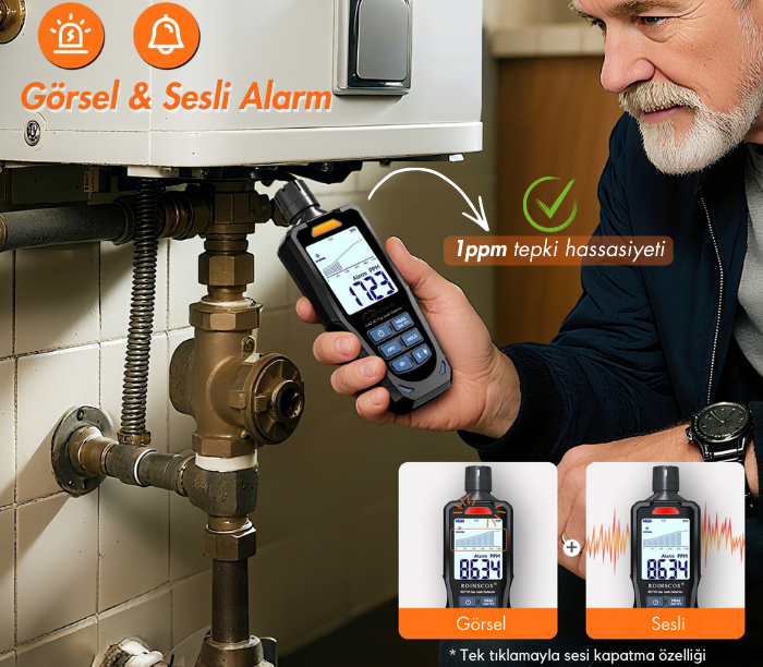 Cihaz, 1 ppm seviyesinde tepki hassasiyetine sahiptir; bu değer muadillerine kıyasla son derece yüksek bir algılama performansı sunar. Ayrıca sesli ve görsel uyarı sistemi sayesinde kullanıcıyı kaçak durumunda anında bilgilendirerek güvenli ve etkin kullanım sağlar.