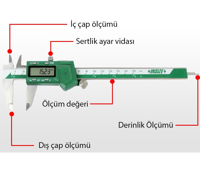 - İnsize 1103-150 dijital kumpas; 0 ile 150 mm arasında ölçüm yapabilmektedir.