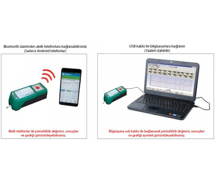 - İnsize ISR-C300 yüzey pürüzlülük ölçme cihazı bluetooth dokunmatik ekran bilgisayarlar veya mobil telefonlar (yalnızca Android) ile kullanılabilmektedir.