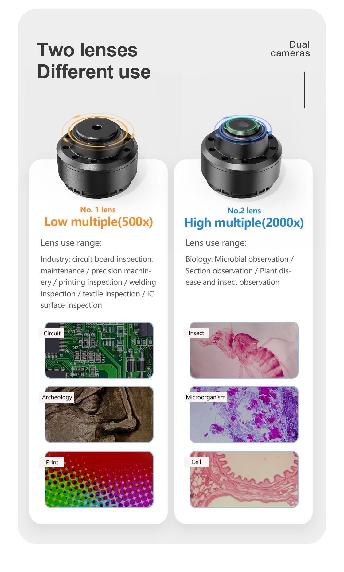 • 500X düşük büyütmeli metal algılama lensi, devre kartı bakımı ve denetimi, baskı denetimi, yeşim taşı ve değerli taşların tanımlanması vb. İçin uygundur.