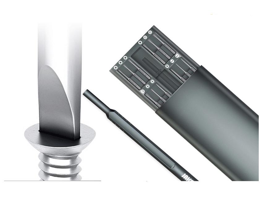 Birbirinden farklı 24 farklı tornavida ucu ile Jakemy JM-8168 Bit Set; Huwai, OPPO, Xiaomi,VIVO, Apple, Macbook ve 0.9 anakart, iPhone 7 ve daha yeni modeller için tercih edilmektedir. Paslanmaz bits uçlarının yanında ergonomik bir kavrama sağlayan sap bölümü konforlu bir tutuş sunar.