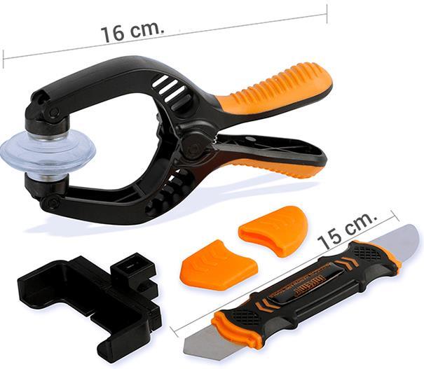 Cep telefon tamir seti içine dahil olan LCD açma pensesi, çalışırken kaymaya karşı kontürlu yapısı sayesinde doğabilecek iş kazalarının önüne geçer. Jakemy JM-OP14 Telefon Tamir Seti deformasyonlara karşı son derece dirençli sap bölümüne sahiptir ve her marka telefon ve tablet boyutuna göre ayarlanabilir yapıya sahiptir. Bir çok işlemde kullanabileceğiniz emme vantuzları ile kullanışlı ve uzun ömürlü bir üründür.