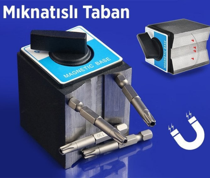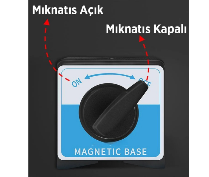 Standın üzerindeki döner anahtar alt tarafta bulunan mıknatısın çekim gücünü ayarlamak için kullanılmaktadır. OFF tarafına çevirdiğinizde zemine tutunma gücü zayıflar ON tarafına çevirdiğinizde yüksek tutunma gücü sağlar. Bu şekilde komparatör standını metal yüzeylere kolayca sabitleyebilirsiniz.