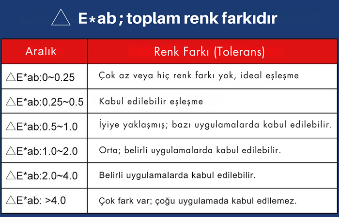 Bu Delta E (ΔE*ab) tablosu, ölçülen renk ile referans renk arasındaki gözle algılanabilir toplam renk farkının ne kadar olduğunu ve bu farkın uygulamalara göre kabul edilebilirlik seviyesini gösterir.
