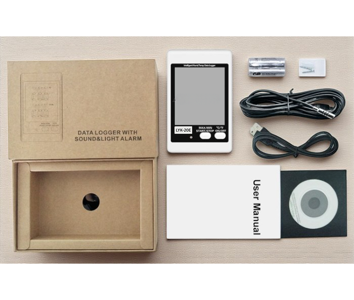 - LYK 20E datalogger cihazını satın aldığınızda, cihazın yanında yazılım CD'si, USB ara kablosu, 3 metrelik harici sensörü, ingilizce kullanma kılavuzu ve pili tarafınıza gelecektir.
