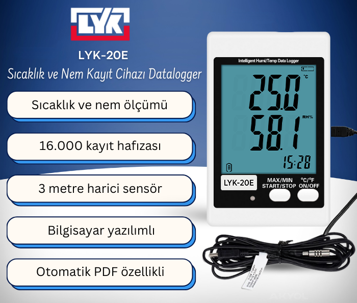 LYK 20E Sıcaklık ve Nem Kayıt Cihazı, 16.000 adete kadar sıcaklık ve nem verisini hafızasında saklayabilen, kayıtlı verileri USB bağlantısı ile bilgisayara kolayca aktarabilen ve otomatik PDF raporlama özelliği sayesinde ek yazılım gerektirmeden ölçüm sonuçlarını düzenli raporlar halinde sunabilen, ekonomik fiyatlı ve hassas bir datalogger modelidir. Daha detaylı düzenlemeler için ayrıca bilgisayar yazılımıda mevcuttur.