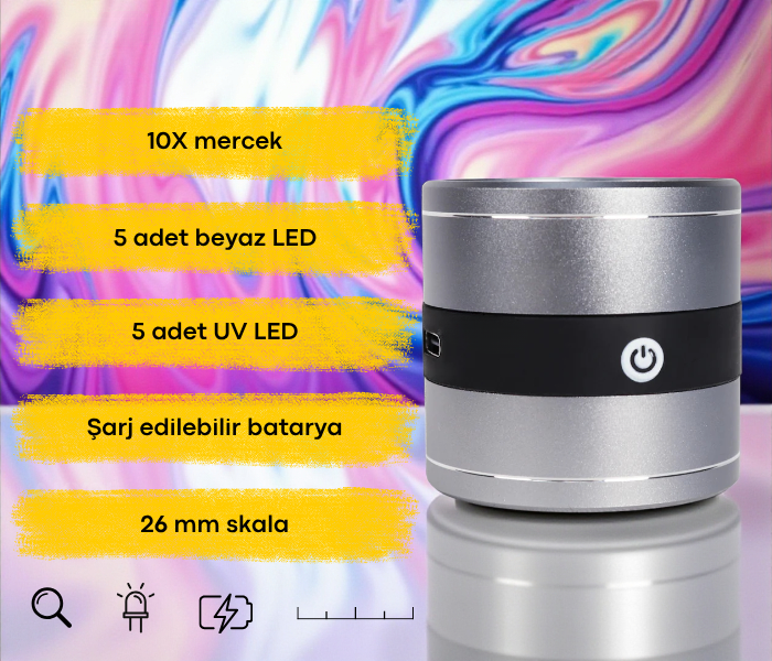 MG 8018 ölçekli lup büyüteç 10X yakınlaştırma yapabilen, 5 adet beyaz LED ve 5 adet UV LED ışığına sahip el tipi bir büyüteç modelidir.
