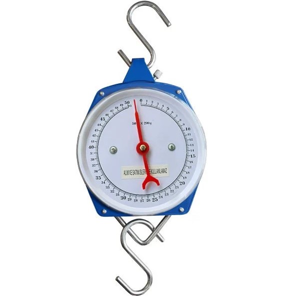 Bu, 50 kilogram kapasite ve 200 gram hassasiyet sağlayan ibreli bir askı terazisidir; genellikle ağır nesneleri tartmak için kullanılır. Ekonomik fiyatından dolayı sık tercih edilen, kullanımı kolay terazilerdir.
