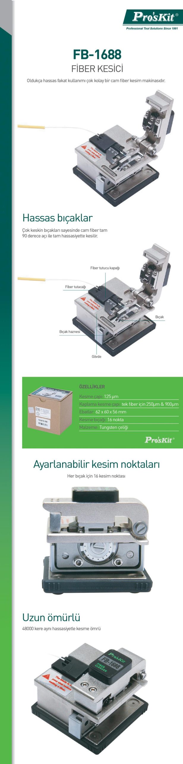Proskit FB-1688 Fiber Kesici, oldukça hassas fakat kullanımı çok kolay bir cam fiber kesim makinasıdır. Çok keskin bıçakları sayesinde cam fiber tam 90 derece açı ile tam hassasiyette kesilir.