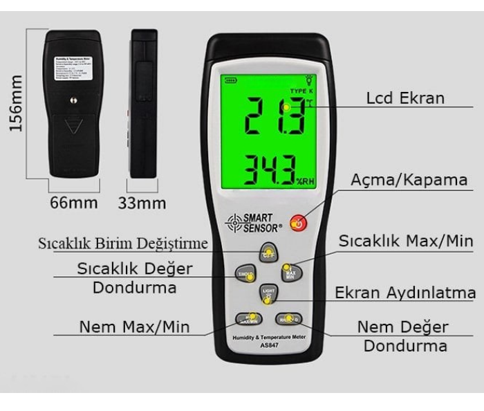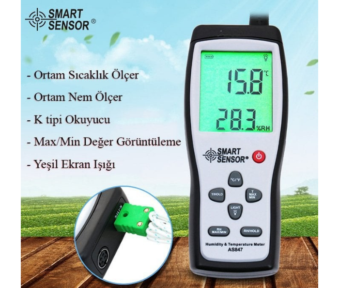 – Smart Sensor AS 847 Sıcaklık ve Nem ölçer; yanında gelen spiral kablolu probu ile sıcaklık ve nem ölçümü yapılabilmektedir.