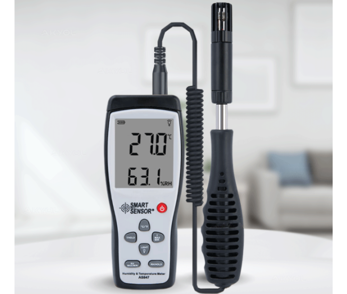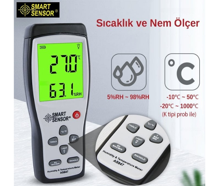 Smart Sensor AS 847 Problu Sıcaklık ve Nem Ölçer; yanında gelen 2 adet farklı özelliklere sahip ölçüm probu ile hassas şekilde sıcaklık-nem ölçümü yapabilen portatif ölçüm cihazıdır.
