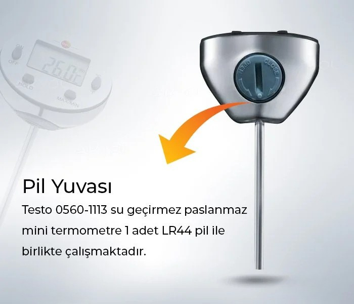 Testo 0560-1113 mini termometrenin pil yuvasını yukarıdaki görselde görebilirsiniz. Pil değişim işlemi oldukça basittir.