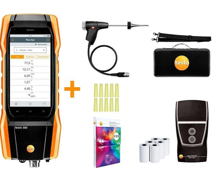 Testo 300 dokunmatik akıllı baca gazı analiz cihazı; O2 (Oksijen) ve CO (Karbonmonoksit) sensörleri ile donatılmış, 2 sensör yuvalı, 4000 PPM'e kadar ölçüm aralığı bulunan, yanında 180mm uzunluğunda prob, yazıcı ve diğer aparatları ile çantası içinde gelen akıllı baca gazı test cihazıdır.