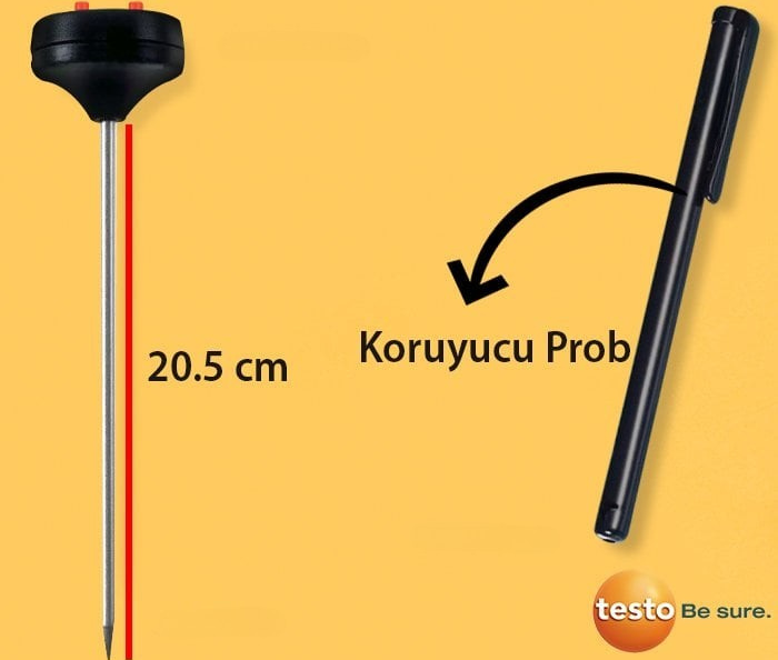 Testo üstten göstermeli mini termometre; 20.5 cm prob uzunluğuna sahip dijital bir sıcaklık ölçüm cihazıdır. Paslanmaz çelik proba sahip olan bu termometre cihazını, sıvılarda ve yarı katı gıdalarda kolay bir şekilde kullanabilirsiniz.