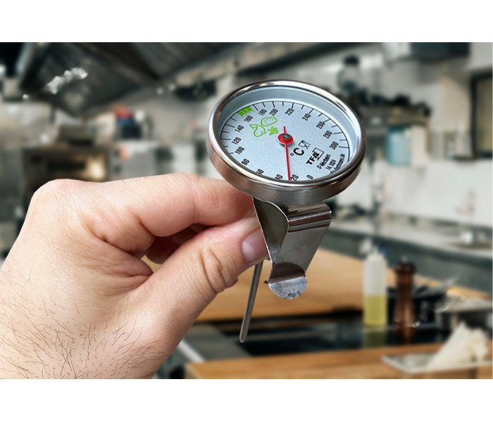 - TFA 14.1024 kızartma yağı termometresi ile sıcaklık takibi yapabilmek için, prob kısmının üzerinde yer alan tutturma aparatı ile kabın kenarına tutturulur, prob kısmı ise yağın içine daldırılır.