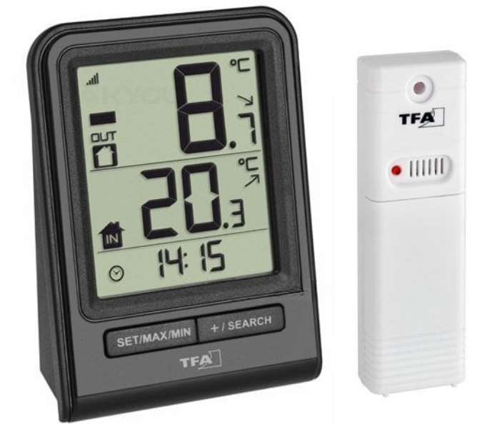TFA 30.3063 termometre; kablosuz sensörü vasıtasıyla, iki farklı ortamın aynı anda sıcaklık değerlerini görebilmenizi sağlayan hassas termometre çeşididir.