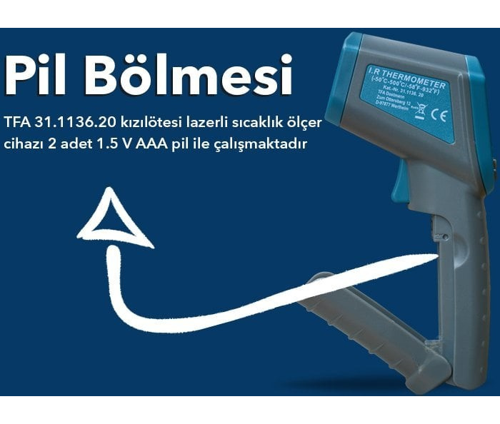 - TFA kızılötesi lazerli sıcaklık ölçer cihazı 2 adet 1.5V AAA pil ile çalışmaktadır.