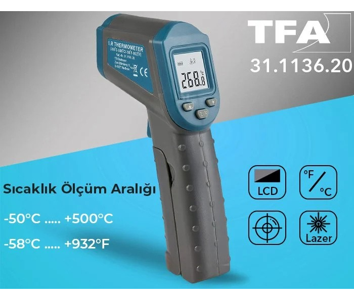 - TFA 31.1136.20 500°C ye kadar sıcaklık ölçümü yapabilen hassas kızılötesi lazerli termometredir.
