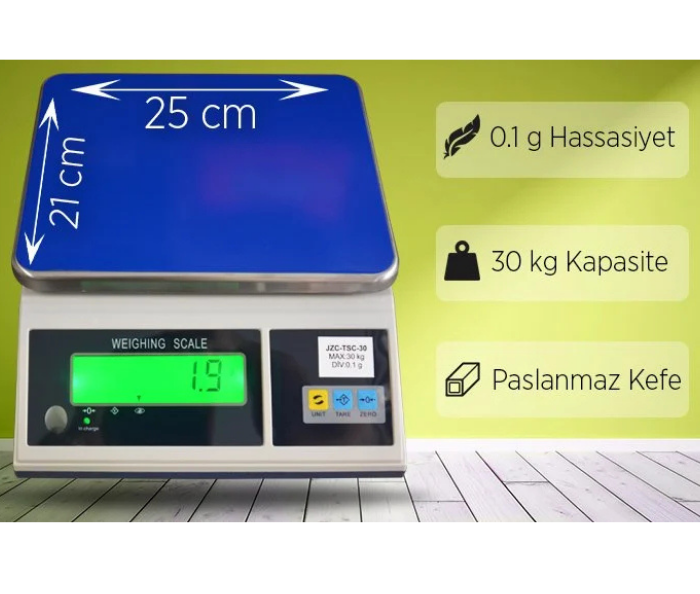 • TSC-30 dijital terazi 30 kilogram kapasiteye ve 0.1 gr hassasiyete sahiptir.