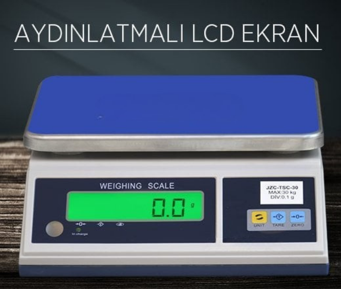 TSC-30 dijital hassas terazi arkadan aydınlatmalı yeşil renkli LCD ekrana sahiptir.