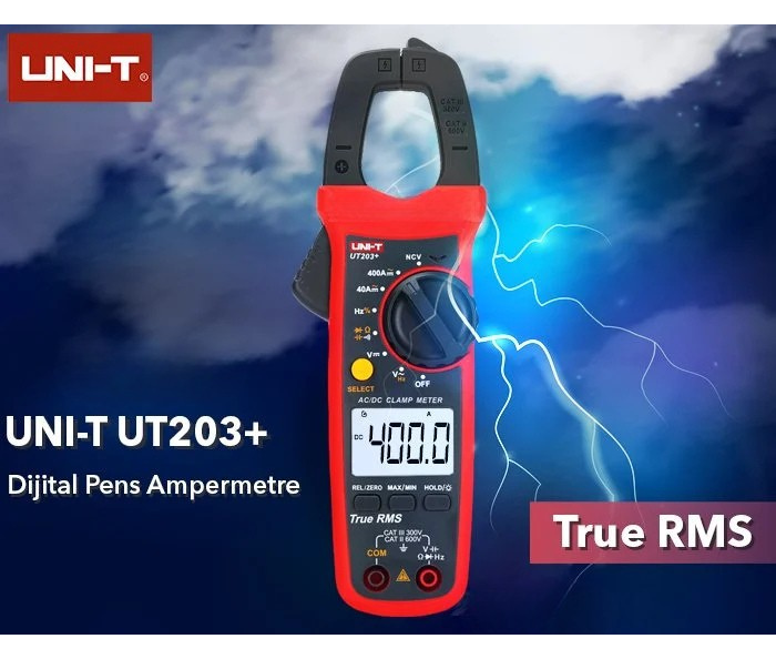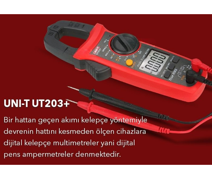 UNI-T UT203+ dijital pensampermetre; sıkışık güç kabloları ya da iletkenlerde temassız akım ölçümü yapmanıza olanak sağlar. Kolay kavrama mekanizması sayesinde her bir kabloyu kolay ve güvenli bir şekilde kavrayabilmektedir. Bir hattan geçen akımı kelepçe yöntemiyle devrenin hattını kesmeden ölçen cihazlara dijital kelepçe multimetreler yani dijital pensampermetreler denmektedir.